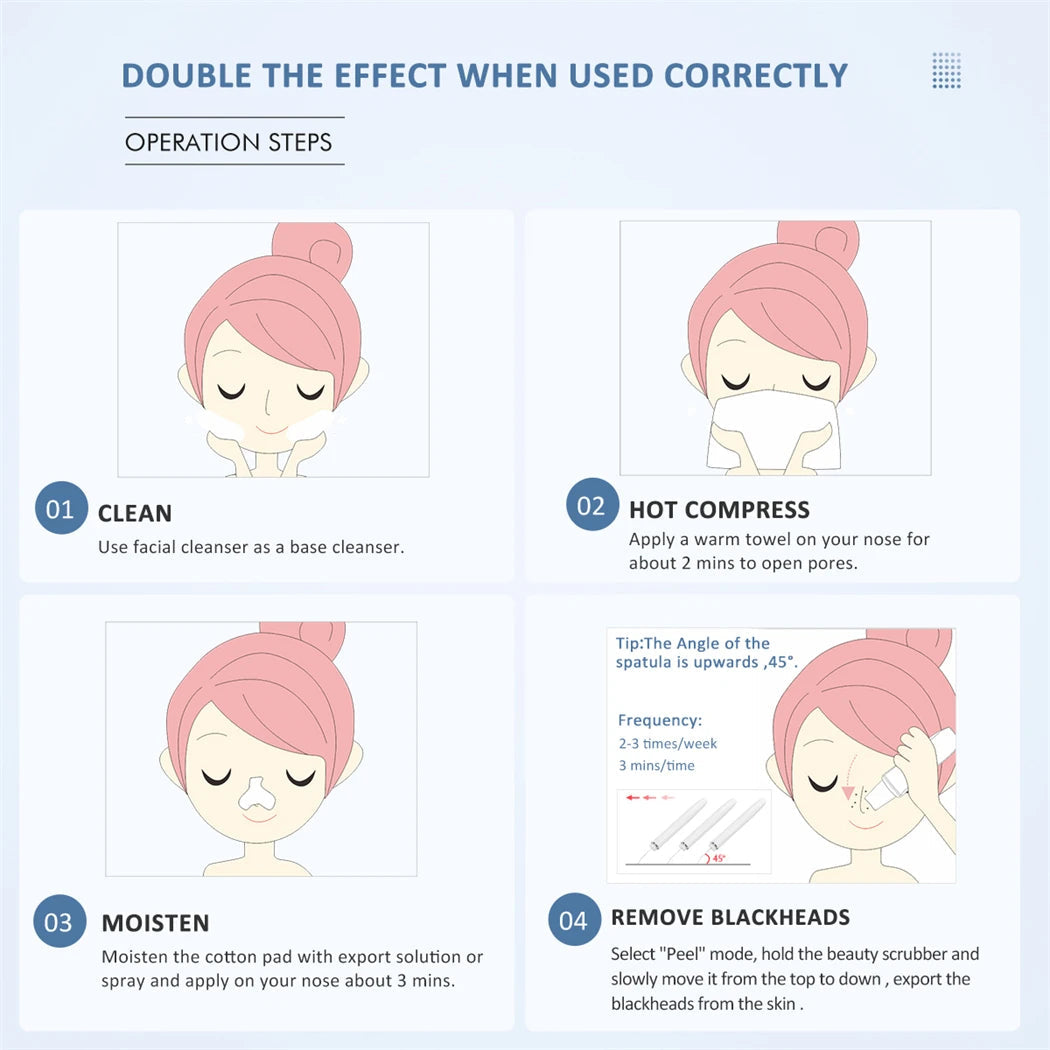 Ultrasonic Vibration/Cleansing Mode (can be used with facial cleanser). Before removing blackheads, it is recommended to first use a blackhead Export Liquid or cleansing mask. Suggested frequency: 2-3 times a week, 3 minutes each time.