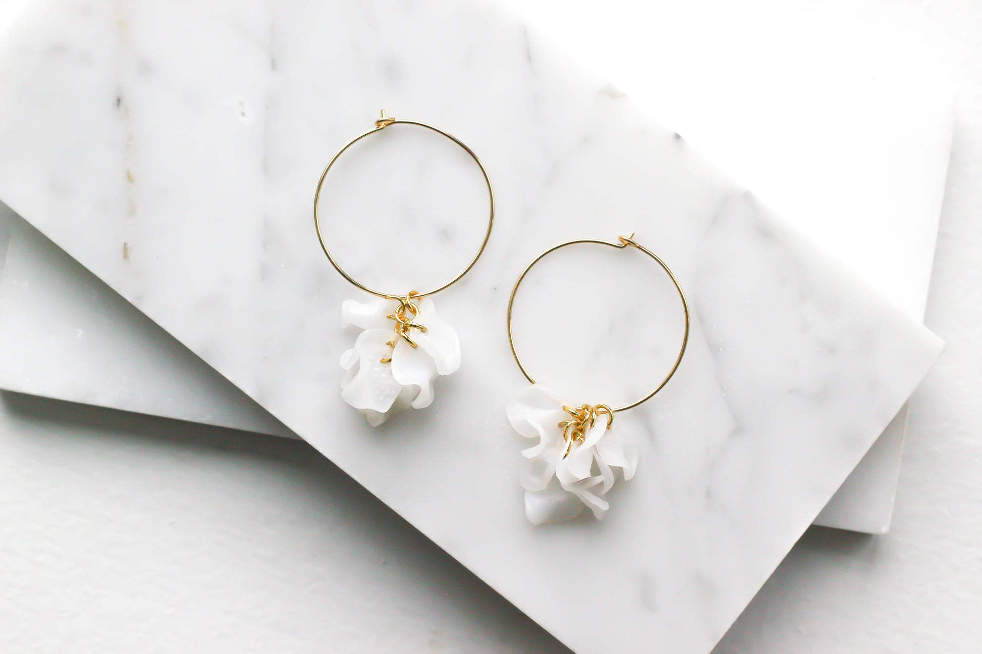 Sustainable 14K gold filled hoops with white flower pendant. Handmade with recycled metals and upcycled bottles in Arlington, VA. Very lightweight and elegant. Dimensions are 1x1.5 inches.