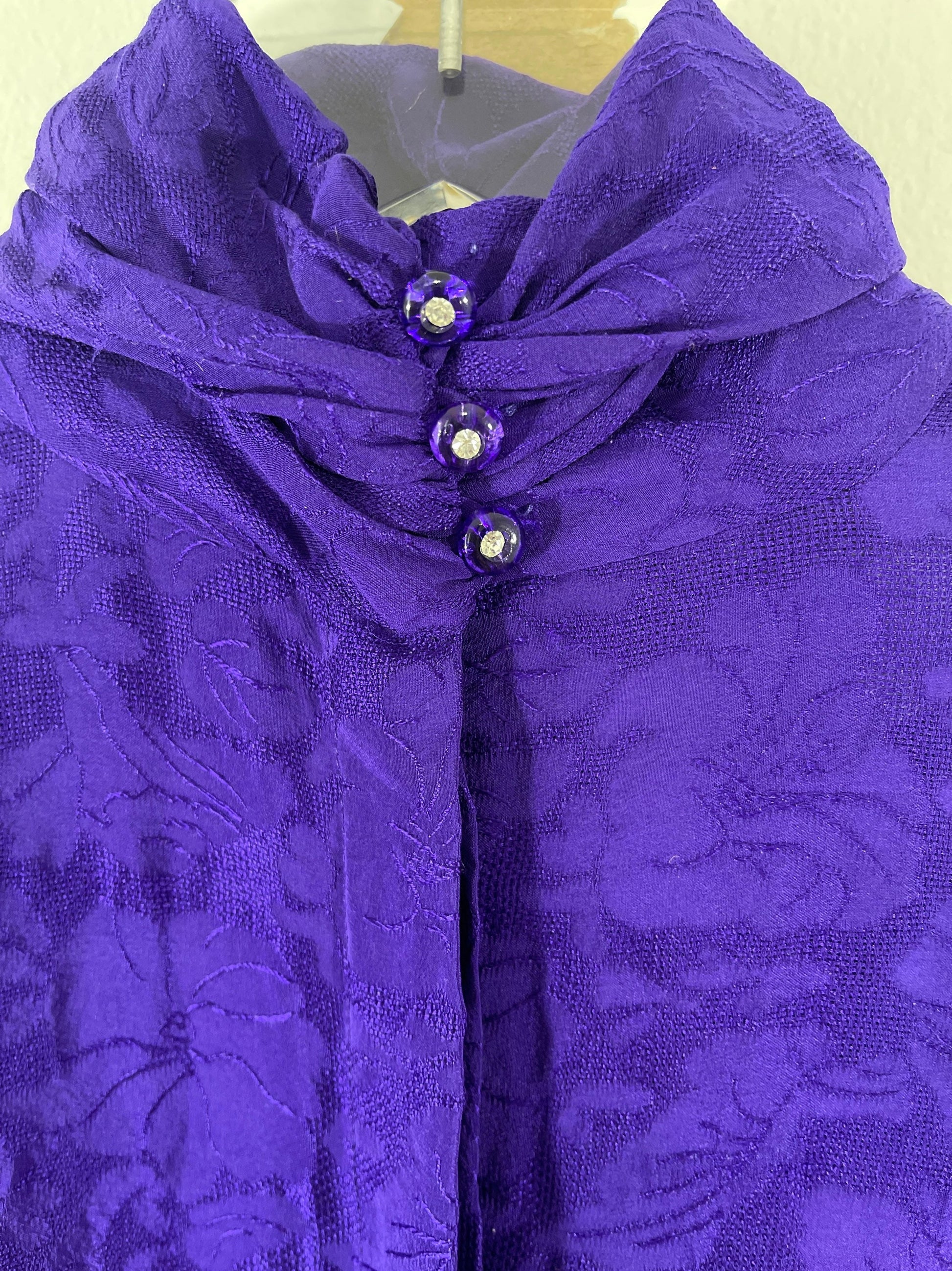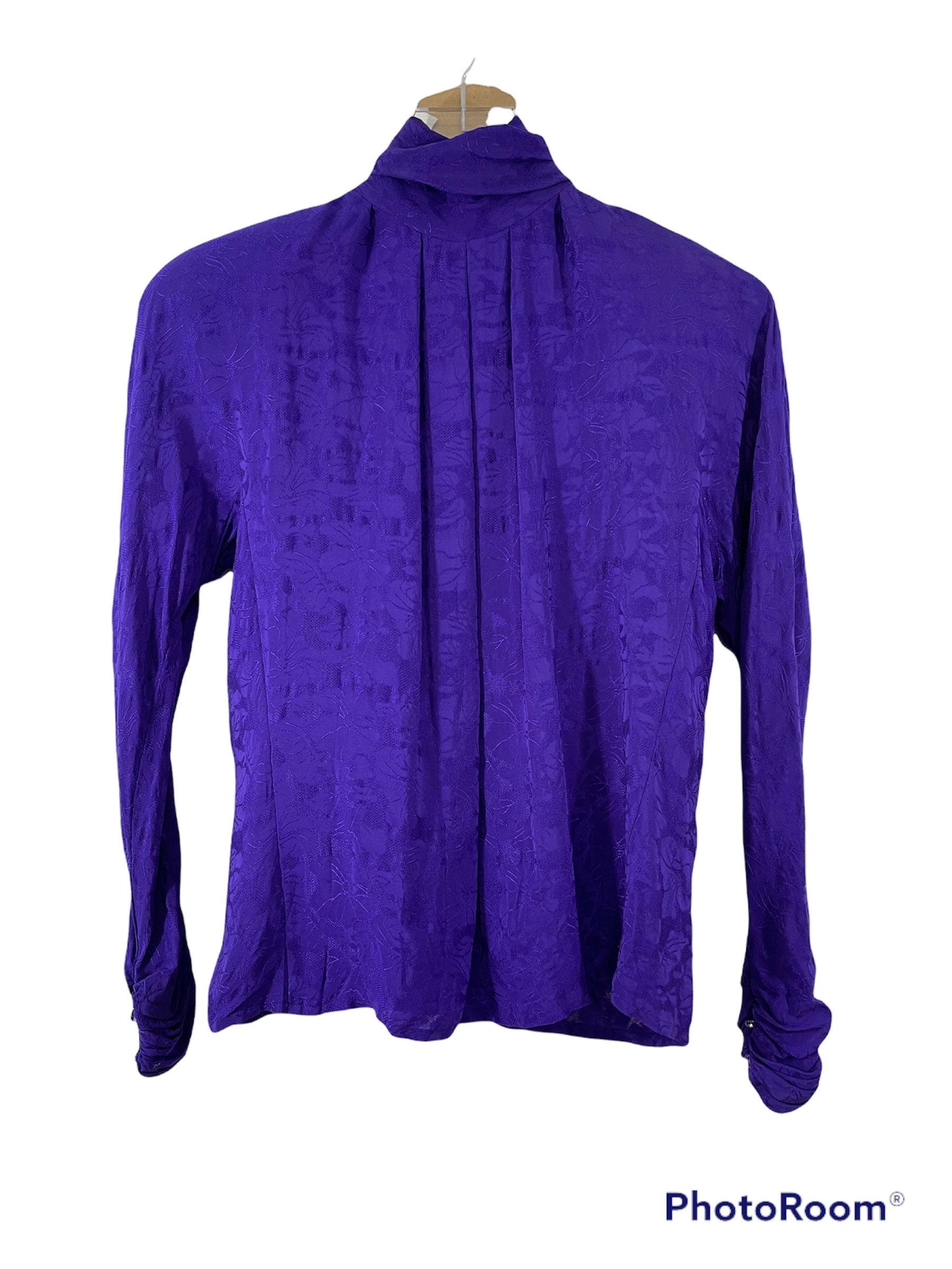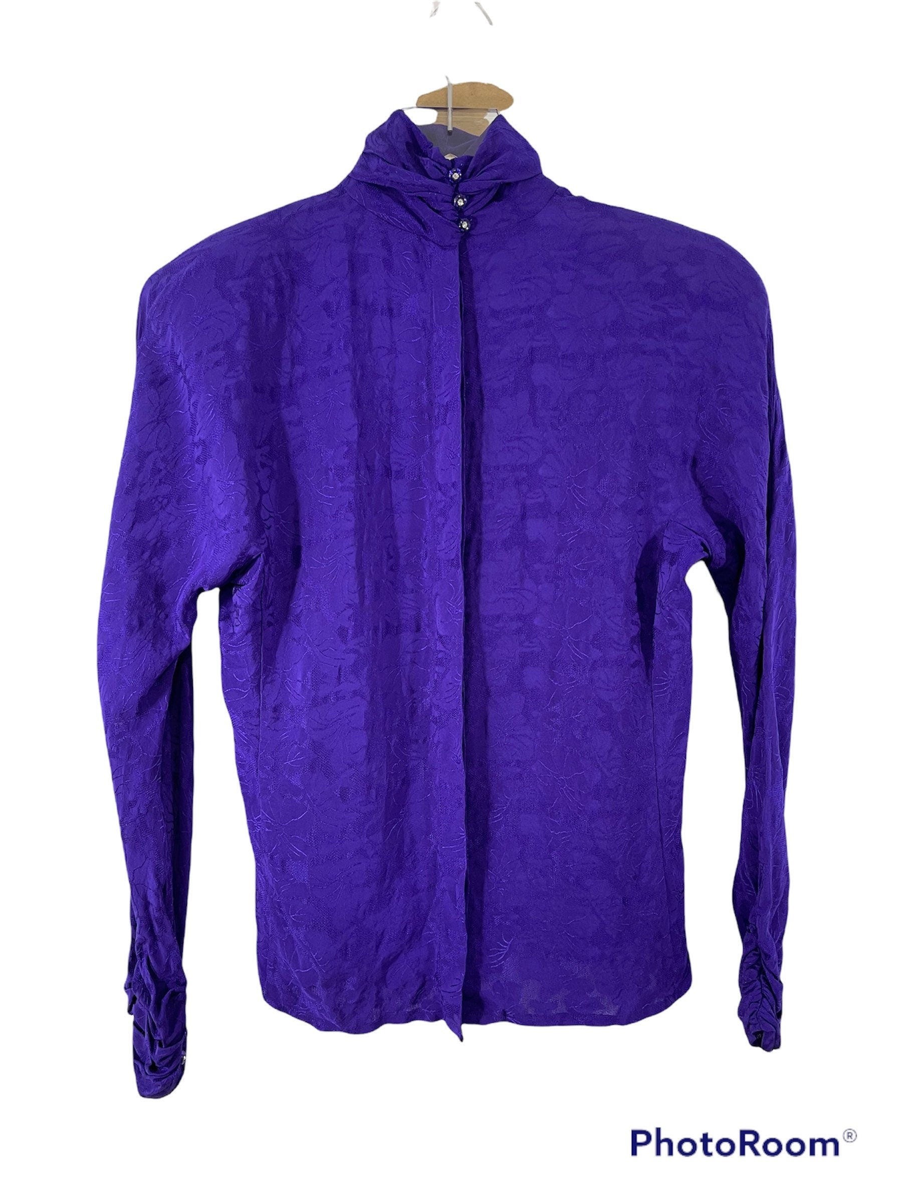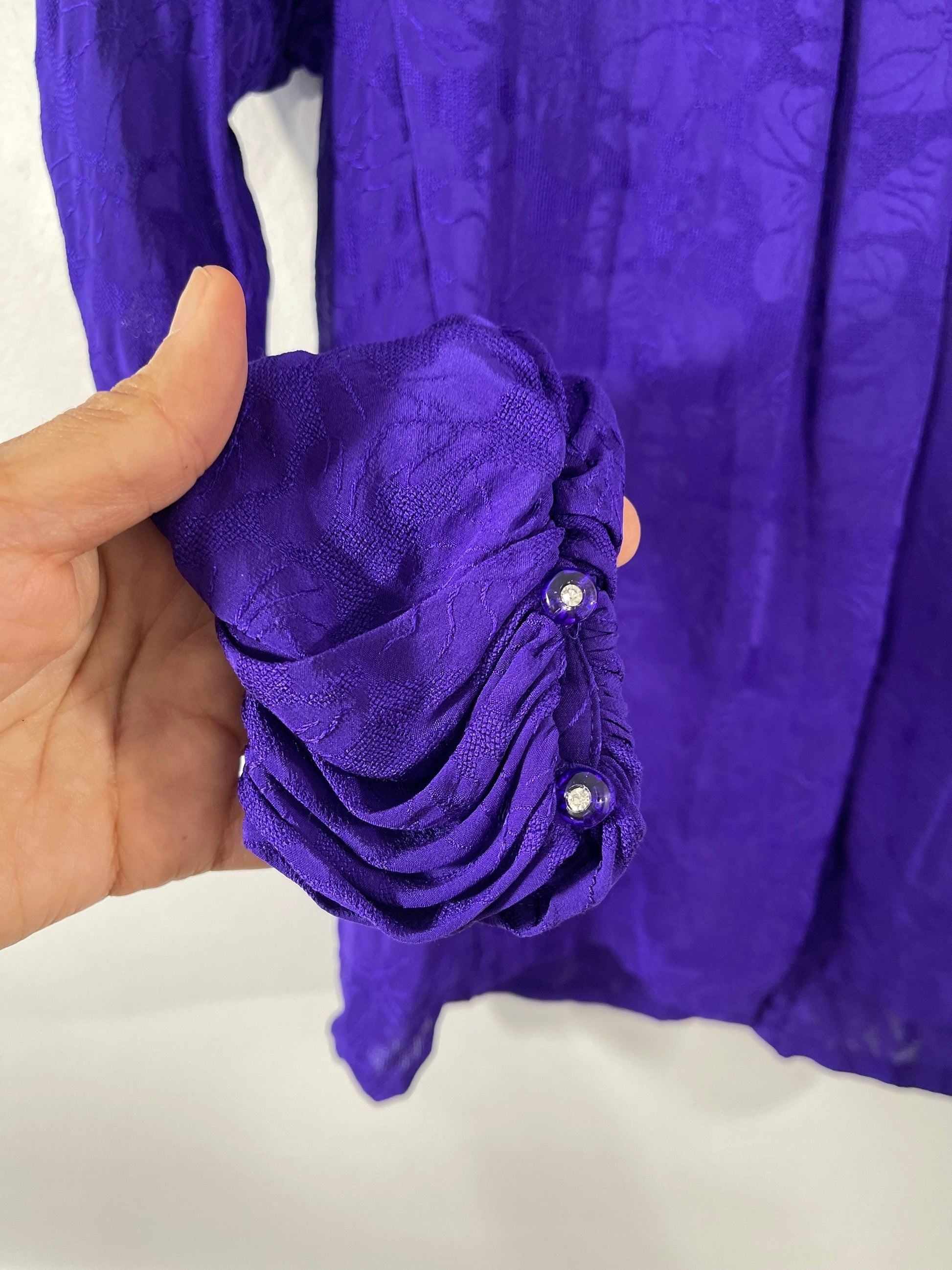 Beautiful Jewel Tone Purple Long sleeved blouse with ruched mock neck and sleeves with rhinestone buttons. Back button closure.